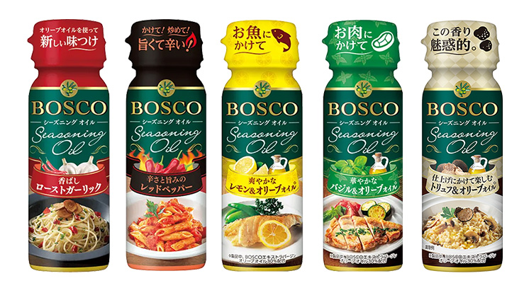 BOSCOエキストラバージンオリーブオイルと、オイルに溶け込む素材の香りが織りなす5種「ローストガーリック」「レッドペッパー」「レモン&オリーブオイル」「バジル&オリーブオイル」「トリュフ&オリーブオイル」のシーズニングオイル。